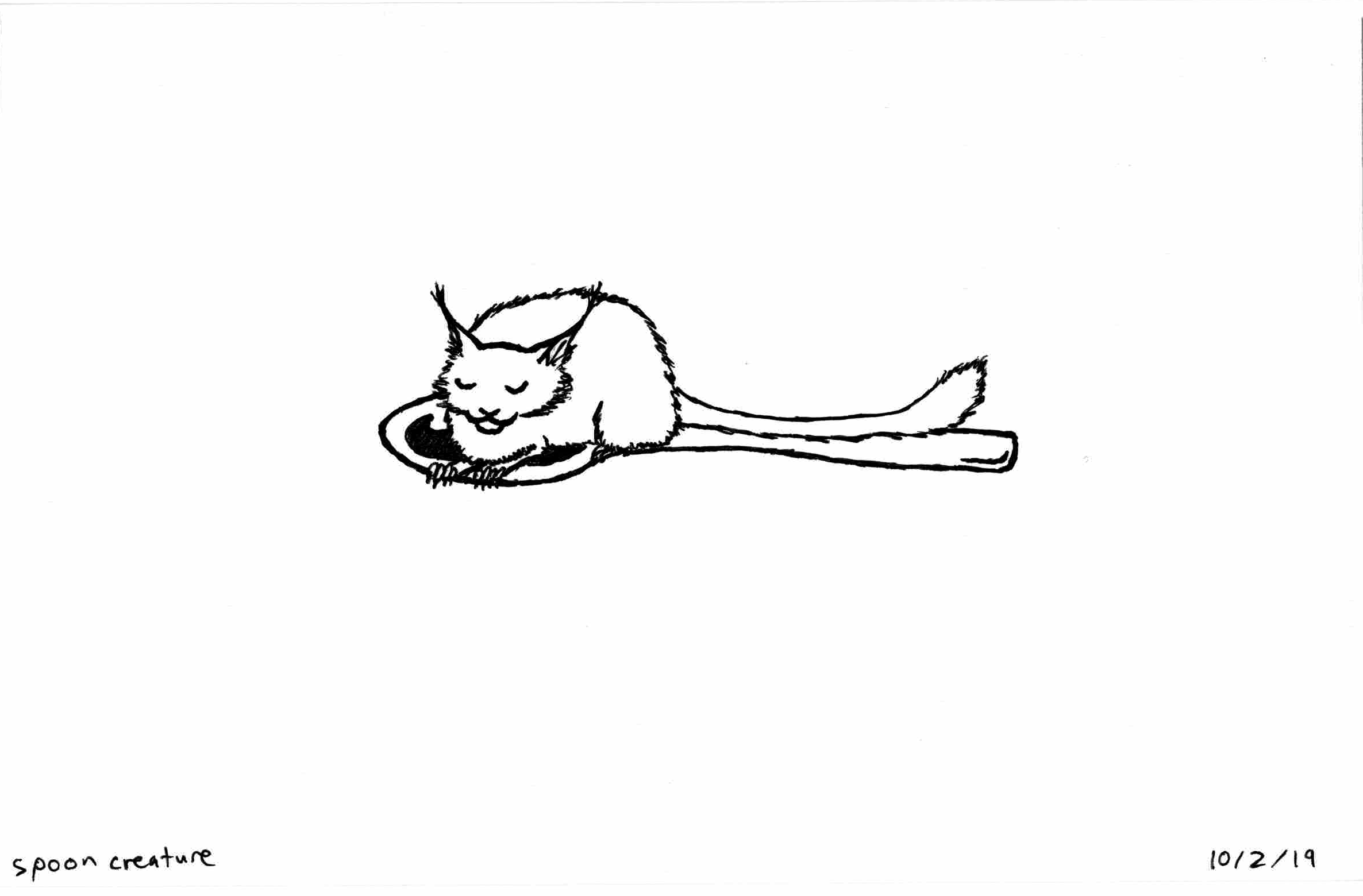 An ink drawing of a rather self-satisfied looking long-eared creature that lies in the bowl of a spoon with its slightly tufted tail resting along the handle.