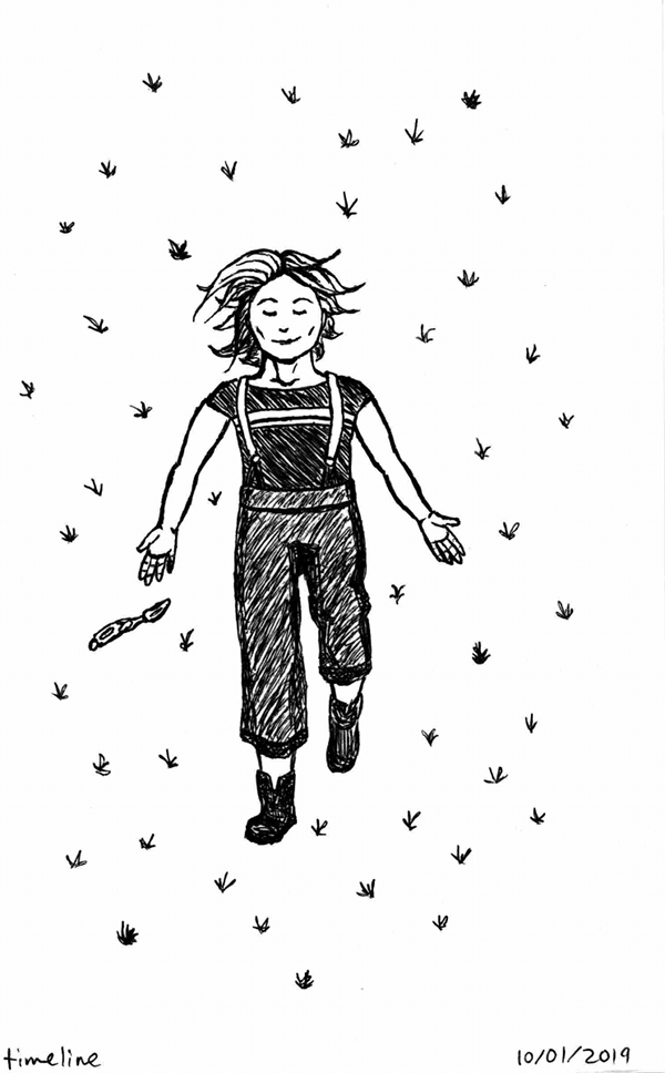 An ink drawing of a woman wearing a short-sleeved shirt with horizontal stripes; suspenders; loose calf-length trousers; and dark boots. She is lying on her back in a field with her eyes closed and her hands open. A sonic screwdriver rests nearby.
