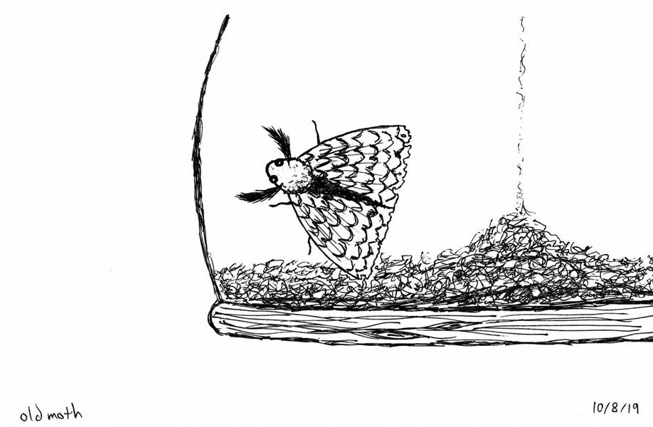 An ink drawing of a slightly tattered moth on the lower bell of a large hourglass that is still running.